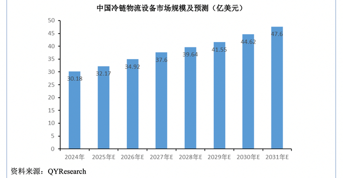 随着国民收入和生活质量的不断提高,消费者对食品的多样性、营养性、口感需求的提升,以及政府部门加大对国家骨干冷链物流基地、产地销地冷链设施的建设,国内冷链物流设备市场保持快速发展。根据QYResearch的统计,2024年,中国冷链物流设备市场规模30.18亿美元,预计2031年将达到47.6亿美元,2024-2031年复合增长率为6.73%。