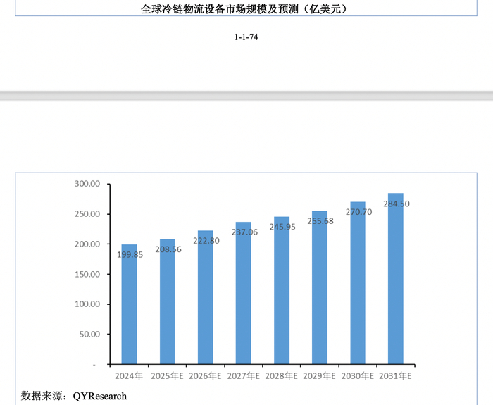 欧洲、美国、日本等发达国家,冷链物流发展早,冷冻食品消费需求大,政府对冷链物流基础设施的高强度投资支出,推动着全球冷链物流设备市场的发展。根据QYResearch的统计,2024年全球冷链物流设备市场规模199.85亿美元,预计2031年将达到284.50亿美元,2024-2031年复合增长率为5.17%。